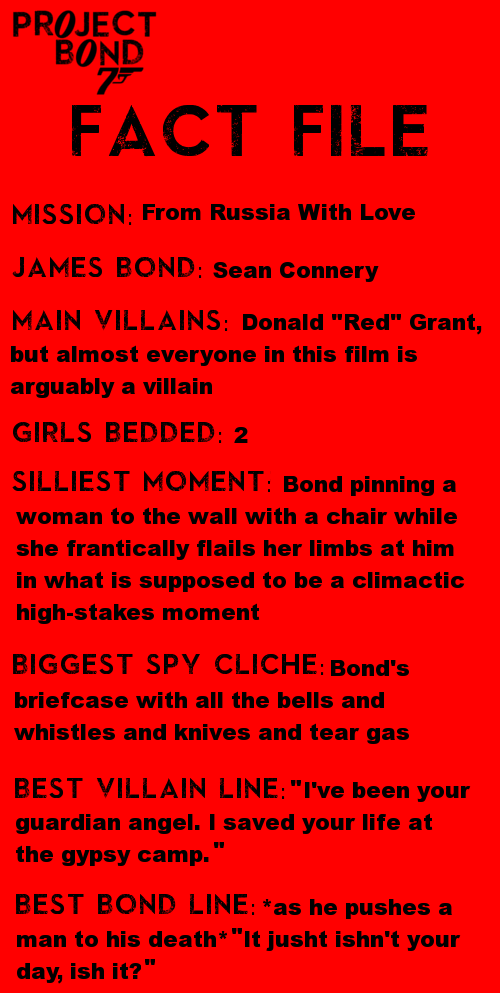 However, the film picks up a bit, because then we cut to James Bond (and, yes, he’s with a lady!), but he is quickly ordered back to heidquarters (but not too quickly, if you take my meaning). He is then sent off on a wacky mission to track down a Russian woman who has been enchanted by his picture and has offered some spy equipment in exchange for some sex, so there’s definitely no time to lose in stopping to think about how dodgy this might be.