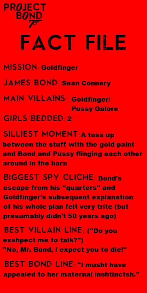 One almost fatal encounter with a laser later, Bond is on his way back to America, in a plane piloted by Pussy, who seems quite unaware that to fire a gun in the cabin would be a bad move. Things look bleak for Bond, especially since the two chaps assigned to keep an eye on him don’t seem to be up to much, assuming that he’d get in touch if he were in any trouble. However, the day ends up being saved, with Bond taking full credit, when only part is really due, and all’s well that ends well.